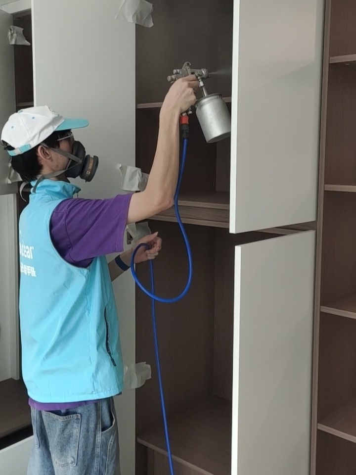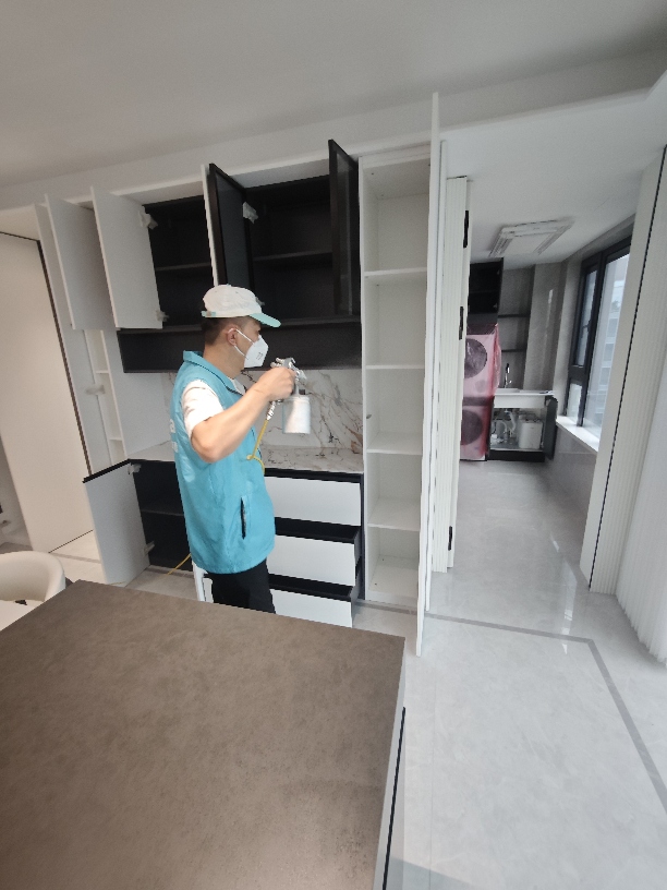 3.正式治理。工程师架好雾化机器,戴好面具、鞋套等,倒入溶液,开始分区精细化治理。墙壁、窗帘、桌子、沙发、柜子、床垫等全部细致地喷涂我们的溶液。