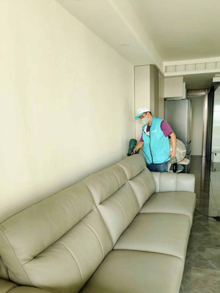 3.正式治理。工程师架好雾化机器,戴好面具、鞋套,倒入溶液,开始分区精细化治理。墙壁、窗帘、桌子、沙发、榻榻米️全部细致地喷涂我们的溶液。
