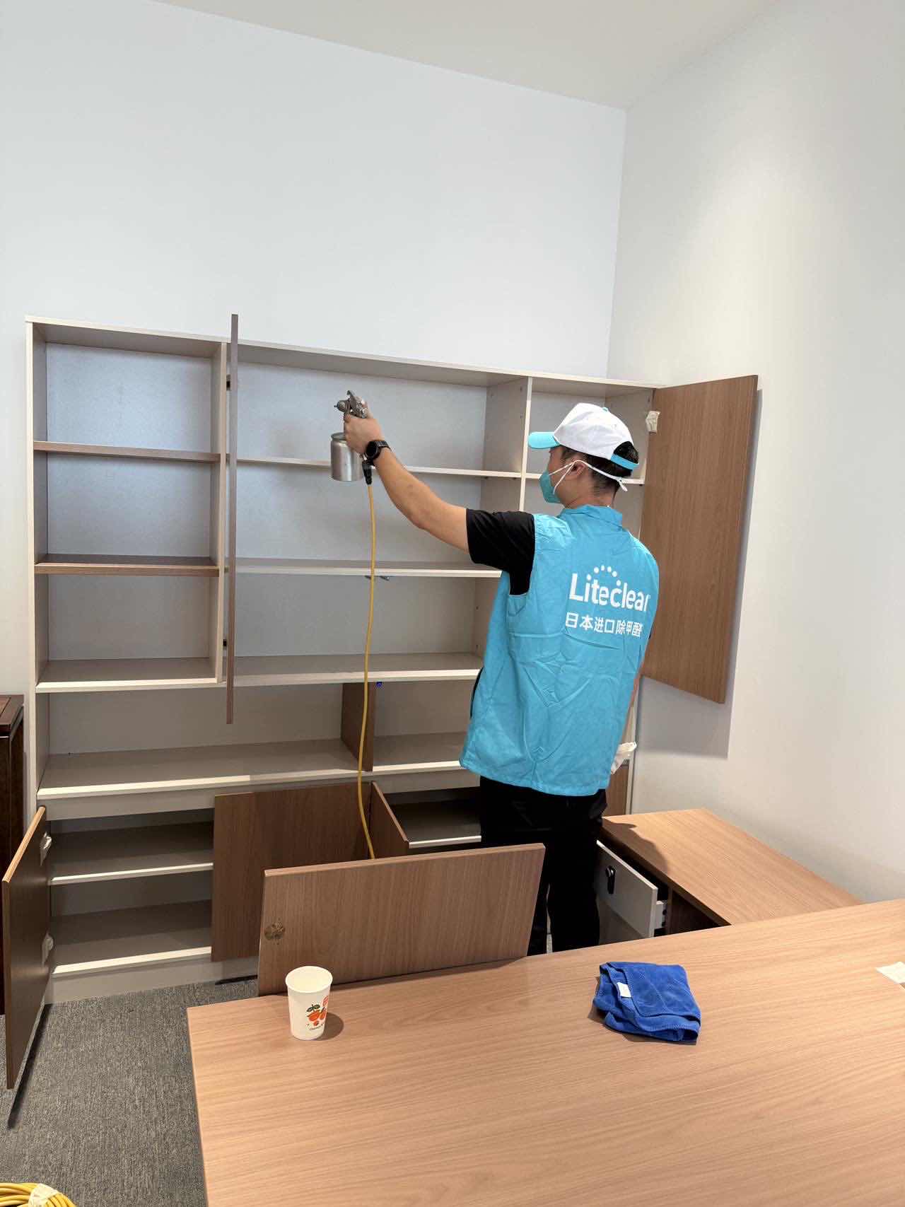 3.正式治理。采用雾化设备,施工人员规范操作,对墙面、办公家具、柜体、窗帘、地毯等全面喷涂治理。