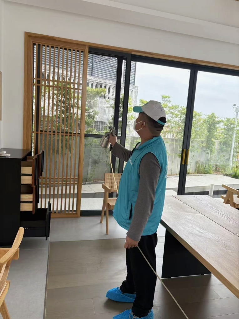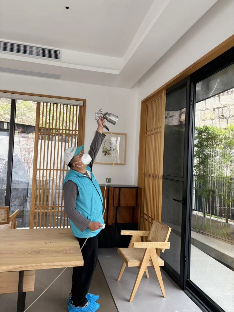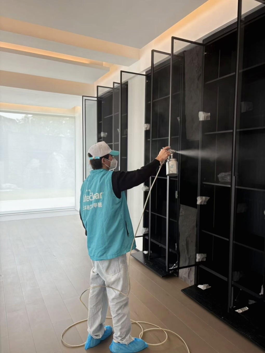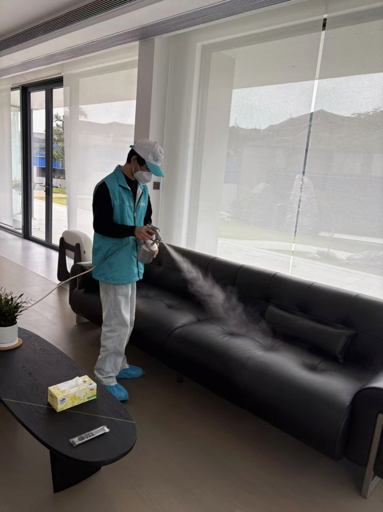 3.正式治理。采用雾化设备,施工人员规范操作,对沙发、柜子、墙面、地板等全面喷涂治理。