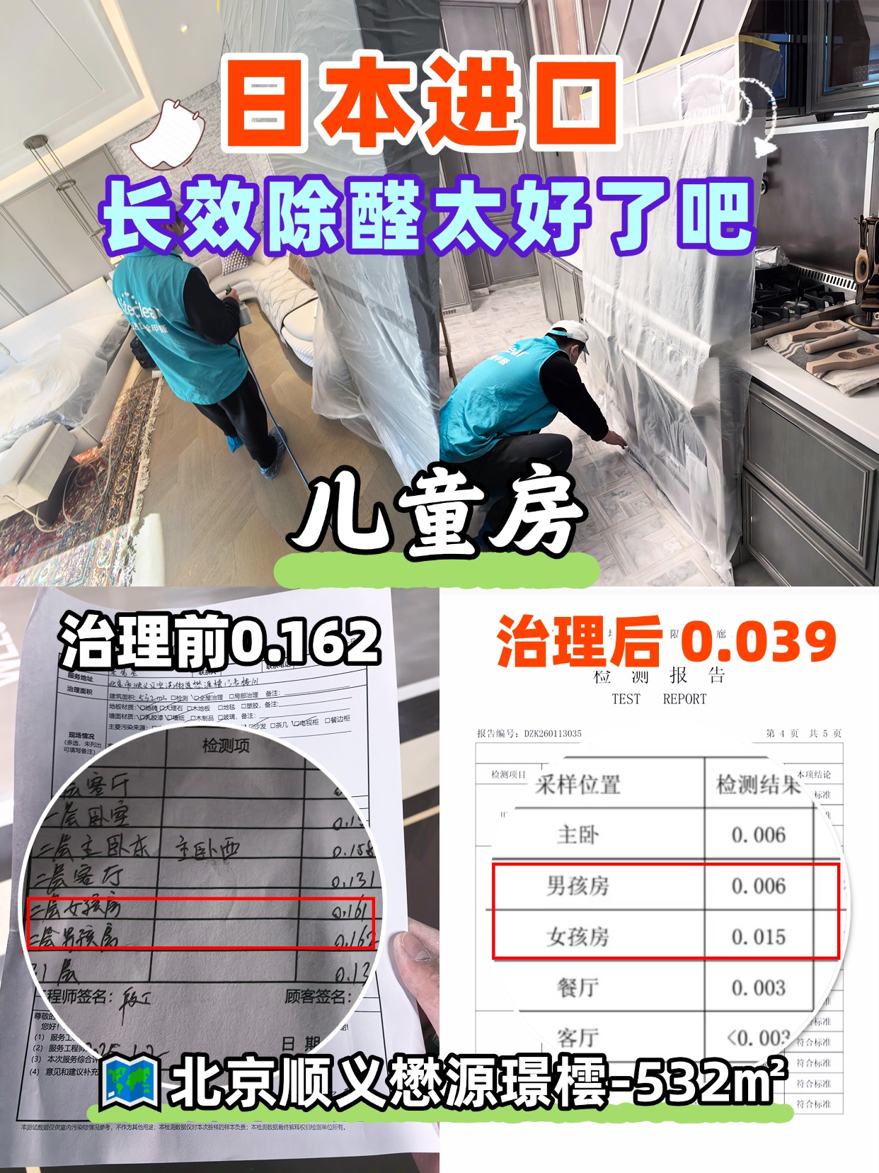 治理后最低甲醛 | 0.039mg/m³(二层男孩房) |