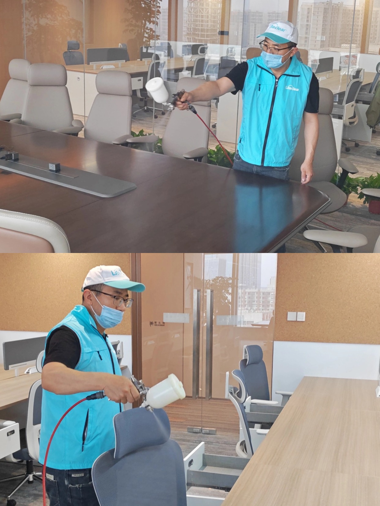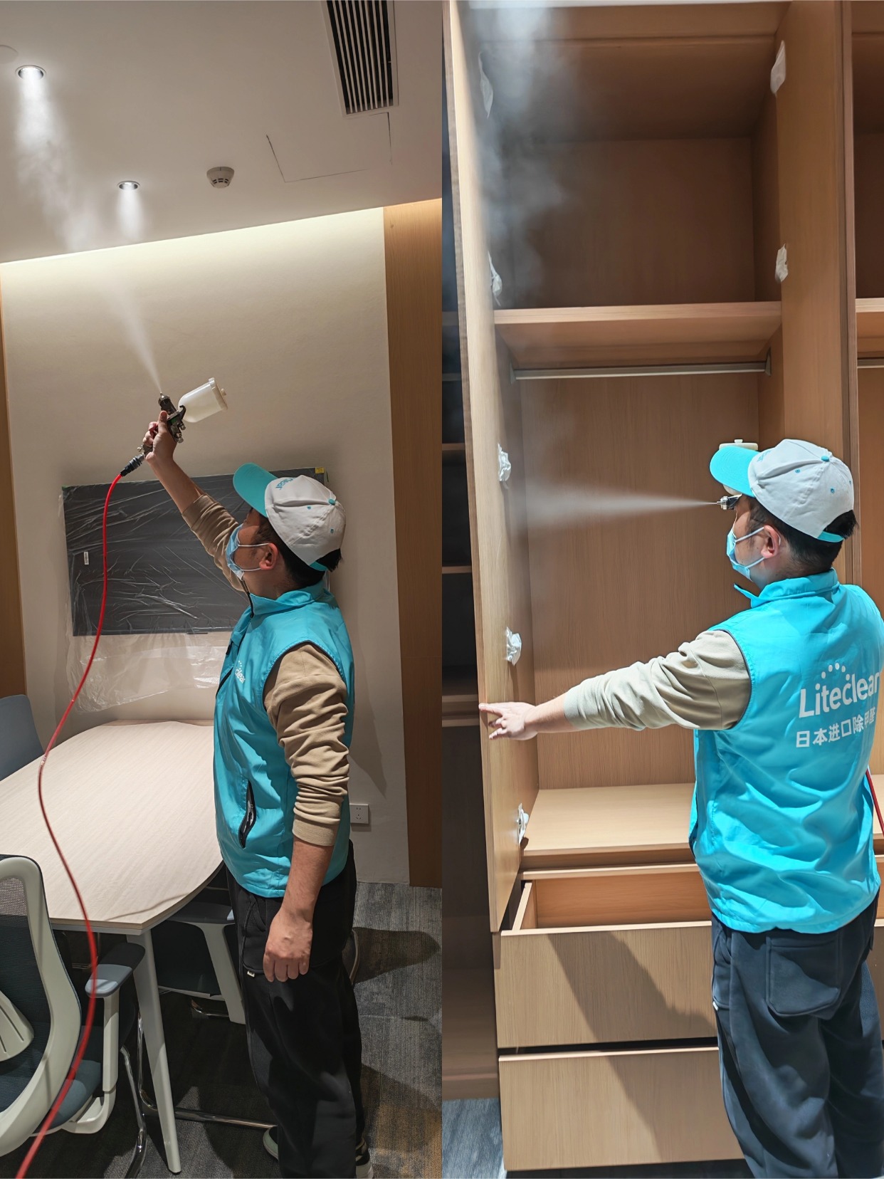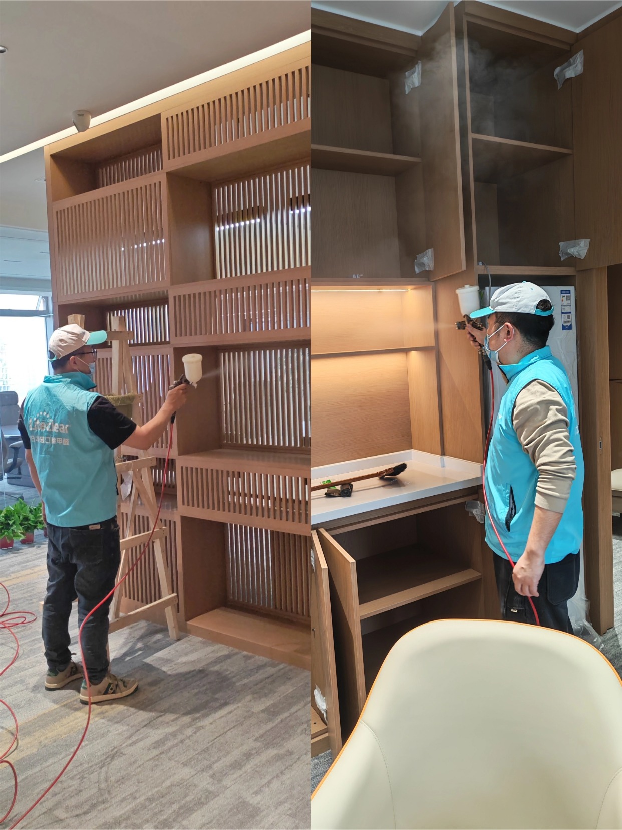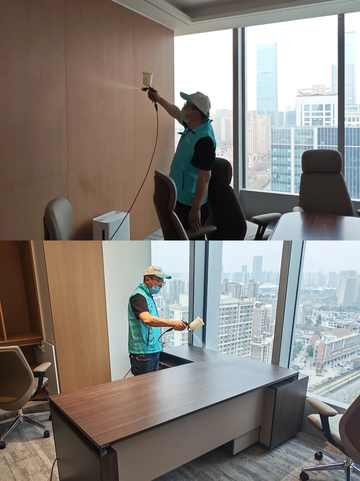第二步是精细化雾化喷涂。针对不同材质(板材表面、皮革座椅、织物窗帘、墙面天花板),采用不同的喷涂压力和角度,确保药剂覆盖均匀、不遗漏死角。